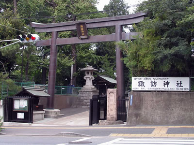 「諏訪通り」に入り、坂道を少し登ると「諏訪神社」の大きな鳥居。