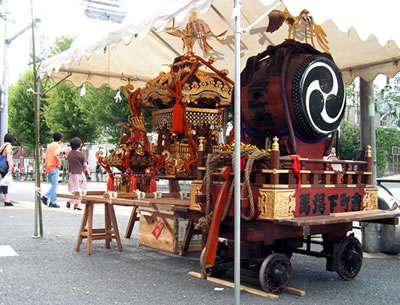 交差点の一角にはりっぱな御輿と太鼓が並んでいた。