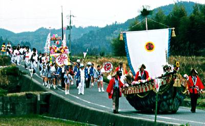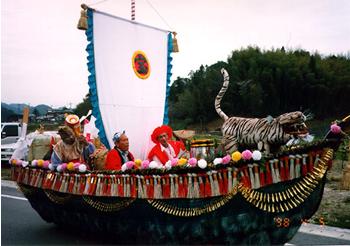 新市(しんいち)町内会のパレードの先頭をゆくのは恒例となった手作りの「宝船・新市丸」。